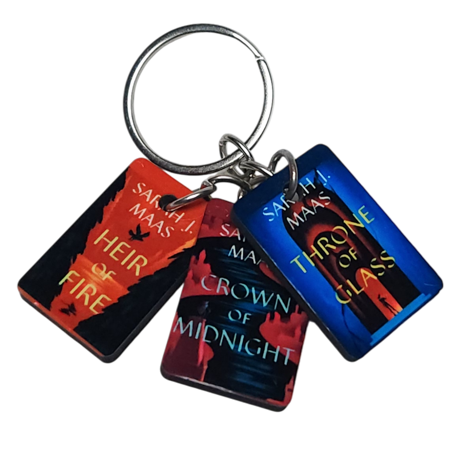 - A keychain with 3 miniature MDF book covers
